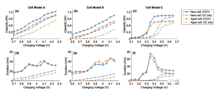 所謂的加速充電模式是在CCCV充電模式的基礎上增加了一個大電流的CC或者恒功率充電過程,從而達到降低充電時間的目的(如下圖e所示),有研究表明加速充電模式能夠有效的提升鋰電池的充電效率,同時又不會對鋰電池的循環壽命產生顯著的影響。
