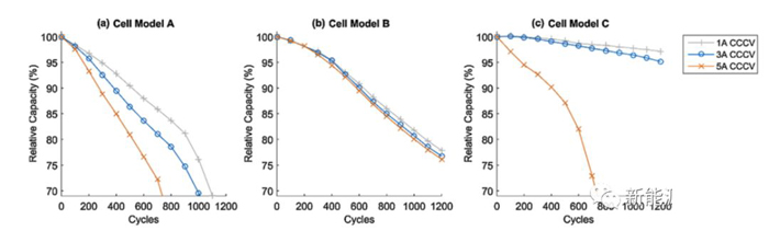 下圖為采用CCCV充電策略時不同的充電電流對于電池循環壽命的影響,從圖中能夠看到對于電池A,大充電電流會造成電池壽命的顯著下降,例如1A充電時電池的壽命可達1000次,3A充電時電池的壽命就會下降到800次,而充電電流達到5A時電池的壽命則僅為600次左右。但是對于電池B不同的充電電流對于電池的循環壽命并沒有顯著的影響。對于電池C在1A充電時電池循環1200次后容量保持率仍然可以達到97%,3A充電時電池循環1200次后容量保持率為95%,但是在5A充電時電池壽命會發生快速衰降,壽命不足700次。
